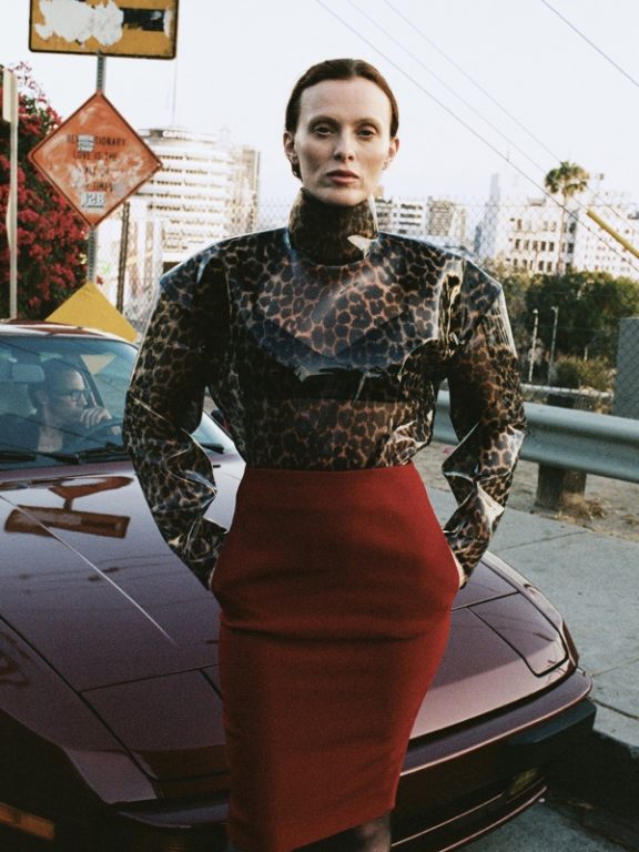 Karen Elson photographed by Max Farago for Wall Street Journal’s Fall Men’s 2025 Fashion story: Lost Highway. Styled by Anastasia Barbieri, with hair by Tiago Goya and makeup by Holly Silius. Read Story