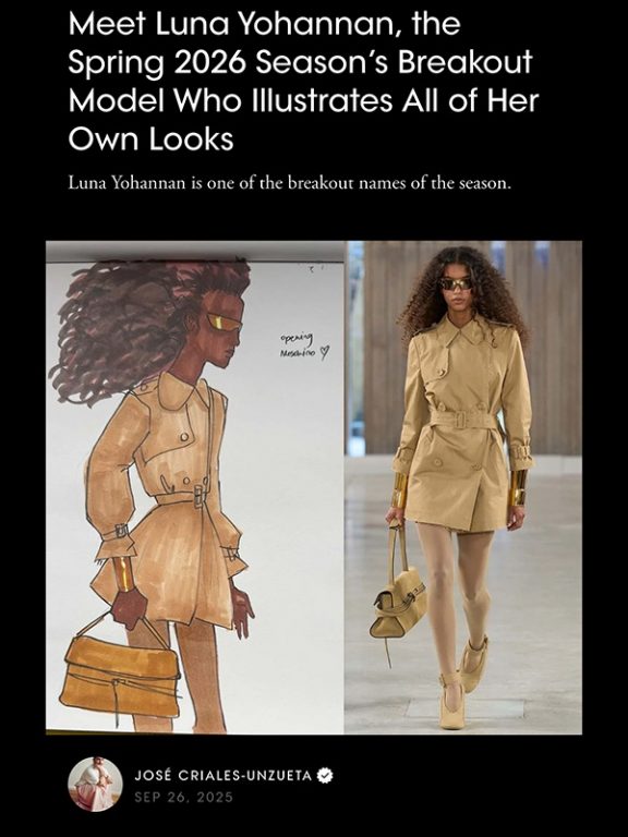 Vogue spotlights Luna Yohannan’s hobby of sketching her Spring 2026 runway looks. Luna has sketched all her shows starting with her runway debut at Michael Rider’s first Celine show. Since then, she has walked for Tory Burch, Altuzarra, Coach, Ralph Lauren, Jason Wu, Alberta Ferreti, Moschino, Max Mara and Missoni. Read article here.