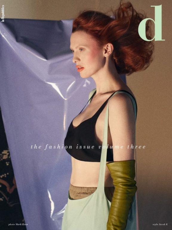 Karen Elson photographed by Mark Kean for the cover of D La Repubblica February 2026. Styled by Jacob K, with hair by Tom Wright and makeup by Lucy Bridge.