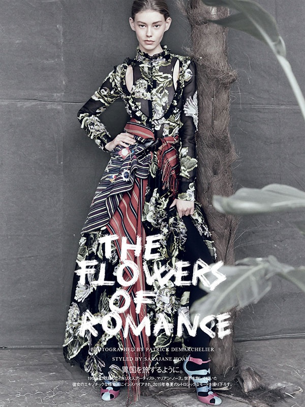 Ondria Hardin appears inside Vogue Japan’s spring fashion issue, dressed in the season’s most romantic pieces, selected by Sarajane Hoare. Patrick Demarchelier photographed Hardin in the solo 10-page story dressed in Dries Van Noten, Sacai, and Céline with hair by Teddy Charles and makeup by Brigitte Reiss-Andersen.