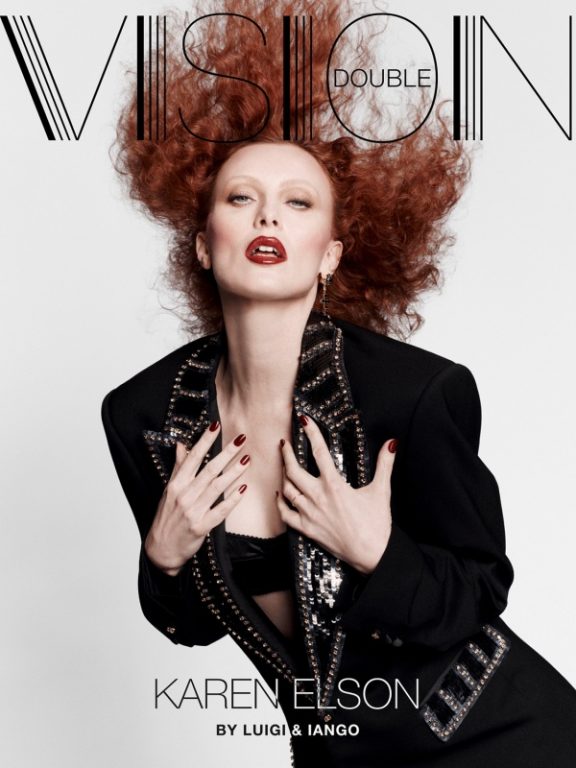 Karen Elson shoots the cover story for the Double Vision 2026 issue, photographed by Luigi & Iango. Hair by Lauren Berrones and makeup by Georgi Sandev. View Story